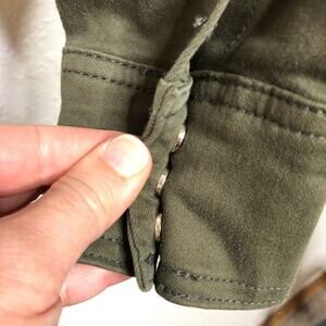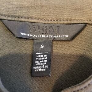 WHBM army green military style lace up waist jacket. Mock collar with full button down front. Criss cross lace up waist. Pleated peplum style hemline. Snap button sleeve cuffs. Size Small. Excellent preowned condition. Minor wash wear.