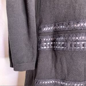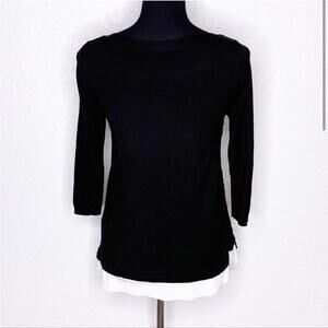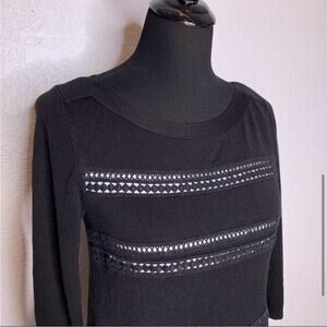 WHBM black knit eyelet crochet trim white lined knit top. WHBM black knit crochet trim with white lining. Pullover style with crew neckline. White lining seen through eyelet crochet trim and at bottom hemline. Size Small. Excellent preowned condition. Machine wash.