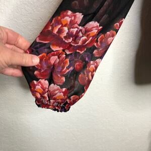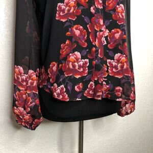 WHBM black red floral sheer button down top. Mock collar with full button down front. Elastic sleeve cuffs. Pleated back neckline. Size Small Petite SP. Excellent preowned condition.