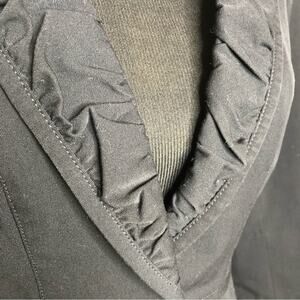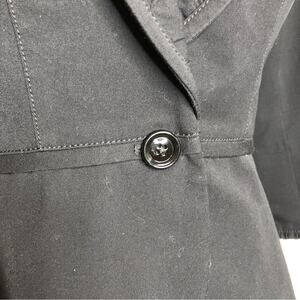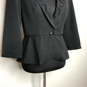WHBM black ruffle trim single button front blazer. Collared with ruffled trim and lapels. Single button front closure. Midlength sleeves. Ruffle trim button sleeve cuffs. Fully lined. Size 6. Excellent preowned condition.