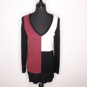 WHBM black white red color block v neck tunic sweater. Pullover style with v neckline. Ribbed hemline and sleeve cuffs. Size Small. Excellent preowned condition. Minor wash wear.