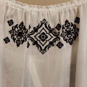 Great sheer white satin like top with black embroidery on front and back elastic waist there is one small ink mark on sleeve near wrist see above photos