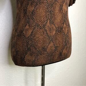WHBM brown and black snakeskin python knit sweater top. Pullover style with scoop round neckline. Short sleeves with gathered button cuffs. Ribbed hemline. Size Small. Excellent preowned condition.