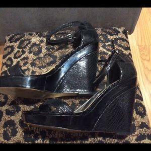 In very good condition other than nick on left shoe. It’s on the right side so won’t been seen from outside. Leather croc, platform, double strap buckle, 5 inch wedge heel.