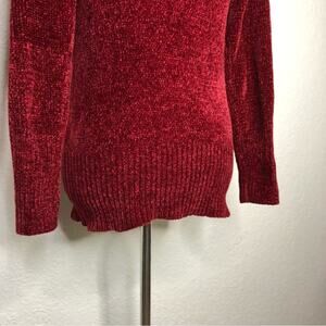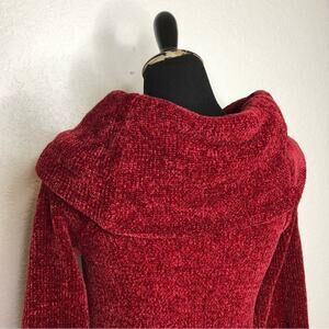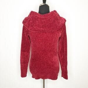 WHBM dark red velour chenille knit cowl neck sweater. Pullover style with oversized cowl neckline. Can be worn off shoulder. Ribbed hemline and sleeve cuffs. Super soft chenille knit. Size Medium Petite. Excellent preowned condition.