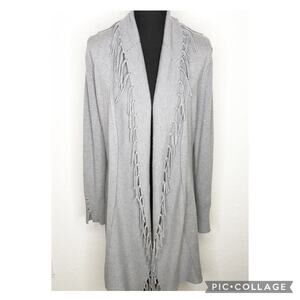 WHBM gray fringe trim open front long wool blend cardigan size Medium