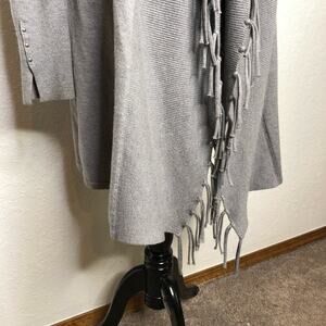 WHBM gray fringe trim open front long wool blend cardigan. Collared with full open front. Fringe trim. Ribbed silver stud slit sleeve cuffs. Size Medium. Very good preowned condition. Some wash wear. A couple of tiny snags on sleeve. Small spot on sleeve.
