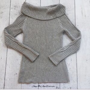 Gorgeous gray White House Black Market cable sweater with shimmery silver lurex thread and sequin accents has wide cowl neck that can be worn slightly on or off shoulders. Top of sleeves & front have areas that are an open weave. Excellent condition, smoke free home. Generously priced at half off! See photos for measurements.