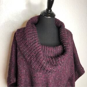 WHBM maroon metallic marled cowl neck belted poncho style sweater. Pullover style with oversized ribbed cowl neckline. Belted at waist. Poncho style sleeves. Ribbed trim. Size Large. Excellent preowned condition. Minor fuzzing from wool and mohair.