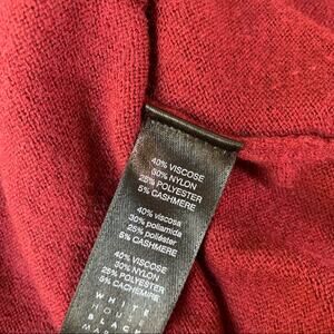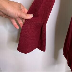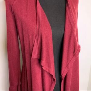WHBM maroon open front waterfall cardigan. Ribbed bell sleeve cuffs. Foldover cascading waterfall lapels. Ribbed band in back waist. Size XS. Excellent preowned conditon. One tiny snag as shown. Viscose nylon polyester cashmere blend. Machine wash.