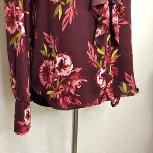 WHBM maroon pink floral ruffle front button down top. V neckline with full button down front. Ruffles down the front. Button cuff sleeves. Curved hemline. Size Small. Excellent preowned condition. Minor wash wear.