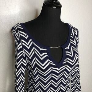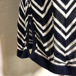 WHBM navy and white chevron knit lightweight sweater tunic. Pullover style with scoop neckline. Cutout with silver bar at front neckline. Side slit hemline. Semi see through knit. Size Small. Excellent preowned condition.