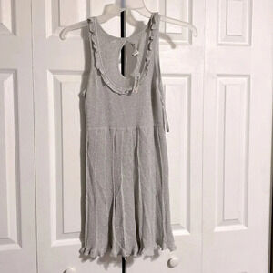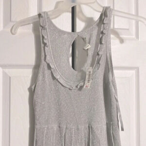 Rayon polyester stretch light weight knit pull over shimmer dress - metallic silver - extra button included. Pleated bottom. Key hole button back. Approximate Measurements Laying flat: pit to pit 14” - shoulder to hem 32” - sleeveless. Preowned good with tag never worn condition please check all pictures