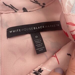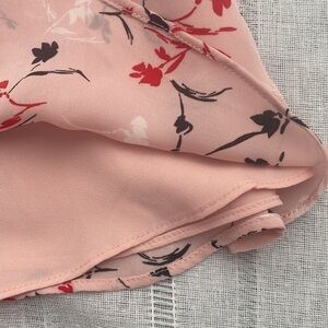 WHBM recreated this romantic pink sleeveless blouse with fabulous pops of red and black. Unique cascading ruffle and curved hem. Size 0 but please see measurements. Zipper and clasp closure in the back. Beautiful condition.