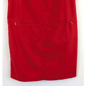 size 10, sheath style dress, stretchy, not lined, 2 front pockets that zip, zips up the back and red in color. Nice condition, no holes, stains or pilling.