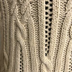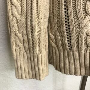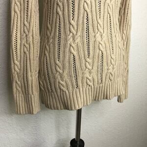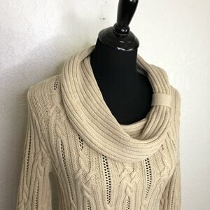 WHBM tan mixed knit cowl neck sweater. Pullover style with ribbed cowl neckline. Mixed open cable knit. Ribbed hemline and sleeve cuffs. Size Small. Excellent preowned condition. Minor wash wear. One tiny spot on front.