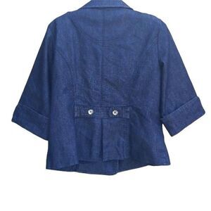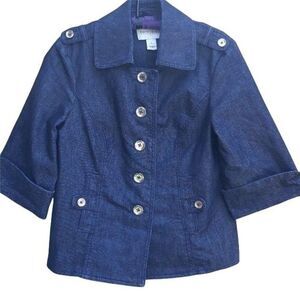 Cotton blend dark rinse Military denim jacket with silver button detailing cinched back and 3/4 cuffed sleeves by White House Black Market.