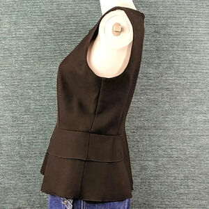 White House Black Market fitted sleeveless top, zips in back to 3" from hem. Two tiered ruffle at hips. Round neckline with a metal bar, V cutout in center.