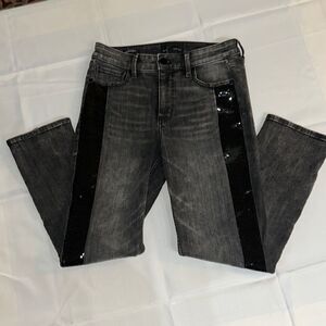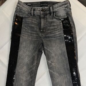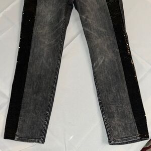 Cute but sexy! Snazz up your wardrobe with these gray jeans featuring black sequin stripes on the sides. Perfect for a chic look. Awesome jeans in great condition. So comfortable and figure flattering!