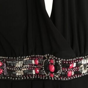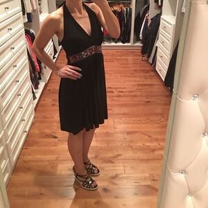 Brand new with tags!! Purchased for $138 plus tax, from White House black market ! Black solid v-neck halter dress. Has red stones, black/silver sequin and clear beads. So pretty in person.