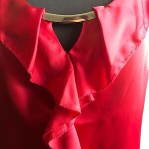 Beautiful WHBM Crimson color sleeveless top. Ruffle front and silver bar at neckline for a dramatic look. Hidden side zipper, two button closure in back and bra strap holder snaps. Fully lined, Bust darts. Excellent condition! Size Medium. Measurements laying flat underarm to underarm 19”, Length 24”.