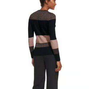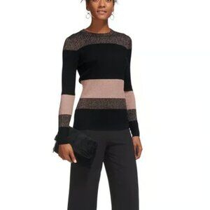 Opt for a sleek knit with this color block style. Knitted in metallic yarn for a subtle sparkle detail, the round neck style features long sleeves and a slim-fit silhouette. Tuck into a pencil skirt or wide-leg trousers for instant elegance.