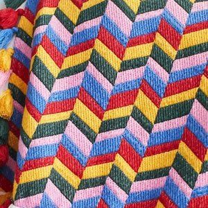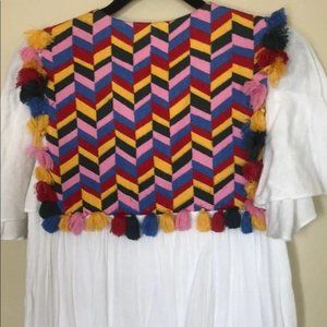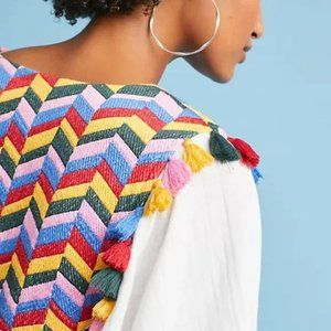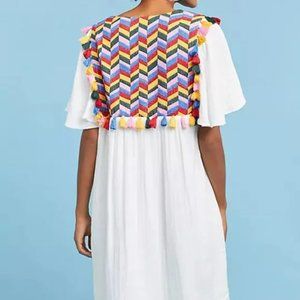 Fluttered sleeves add a feminine touch to this vibrant, tasseled silhouette.