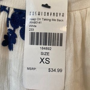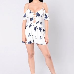 White and blue floral romper. Brand new with tags. Off the shoulder with cross front, open back and size zipper. Size XS from Fashion Nova