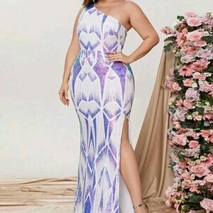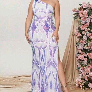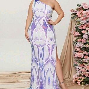 WHITE AND PURPLE PARTY PLUS SIZE CONTRAST SEQUIN ONE SHOULDER GRAPHIC PRINT MERMAID MAXI GOWN FOR SPECIAL EVENTS