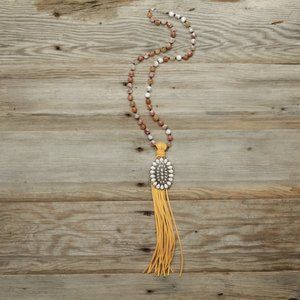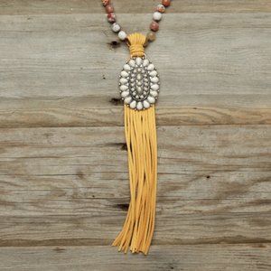 WHITE BEADED OVAL & ORANGE TASSEL PENDANT NECKLACE