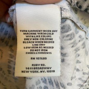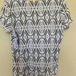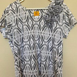Adorable flower embellishments. White, black & gray short sleeve top.