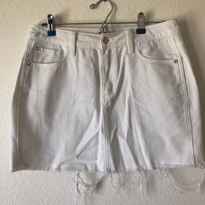This is a white denim skirt that has fraying at the edges. It's high waisted and can be cut to fit any length.