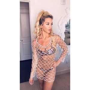 WHITE CROCHET FISHNET SWIMSUIT COVER UP LONG SLEEVE BEACH POOL TOP SHIRT CU7165