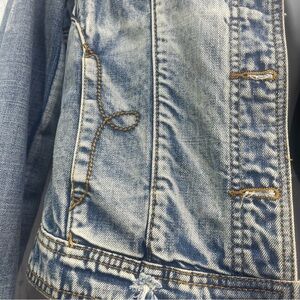 Medium to light blue distressed denim, stitching at pockets, 2 chest button pockets, button up closure, distressed throughout, colors may vary due to lighting, good used condition, Small