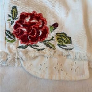 Crochet part on the bottom of shorts and frayed hem making them look kind of vintage.