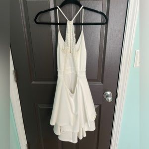 White formal dress, thick silky material (you can tell the quality is good), lacy back withe zipper, perfect for fancy events or even able to dress down. I wore it one time for graduation otherwise has not been in use!