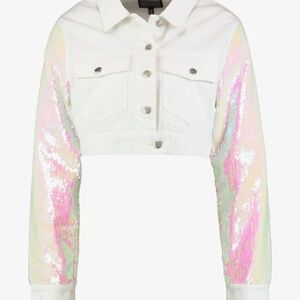 Ok So I love when casual and glam come together!! Just look at this white denim jacket with statement sequin sleeves!! I am just loving it and you will too!!