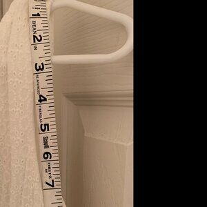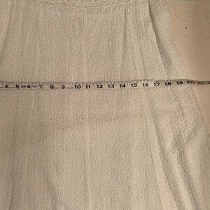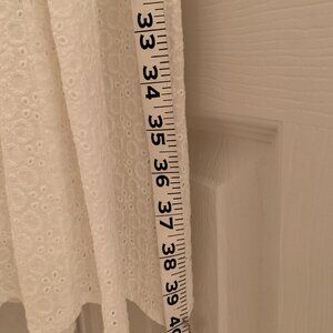 WOMENS EYELET WHITE DRESS, LIGHTLY LINED, ZIPPER BACK, FLARED STYLE, NEW WITHOUT TAGS, NEVER WORN. VERY CUTE DRESS, CAN BE WORN WITH A LIGHT JACKET, SWEATER, BOLERO. SIZE 12. APPROXIMATE MEASUREMENTS: LENGTH 40", I AM 5'4" HITS RIGHT BELOW KNEE, SHOULDER TO ARMPIT 10", ACROSS CHEST 15", ABOUT MID WAY 20", BOTTOM 32". 100% COTTON.