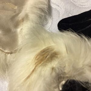 This is a vintage item. I believe it’s rabbit fur it is lined on the back and gorgeous beautiful satin looks like an area where there might’ve been a price tag and it’s a little tiny area. There doesn’t hurt the wearability of it. It’s been meticulously stored. The item itself is 16 inches long. I’m not sure how this actually goes, but it does have a snap And then it has the little velvet black ribbon with the tassels. It’s kind of put on with a pin so we’re selling this exactly as shown and we hope that you enjoy looking at our beautiful vintage pieces this month no smoke no pet selling exactly as you see described if you’re looking for positively perfect this may not be for you if you don’t mind a tiny little bit of TLC which I believe is all that this needs it’s really a rare item. Whoops, I see one more little stain on the POM POM OF ONE. and I’m taking a picture of that right now selling as shown.