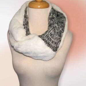 Double Sided White Faux Fur and Black and White Cable Knit Twisted Infinity Scarf.