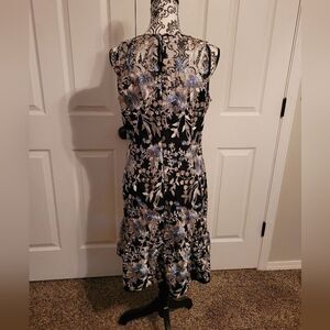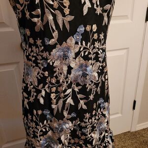 Absolutely beautiful dress. Retails for 220 dollars. Made with polyester materials. Size tag is missing so please check Measurements before buying.