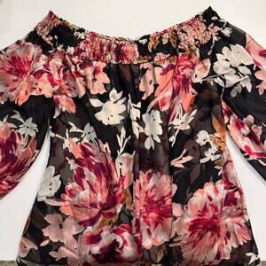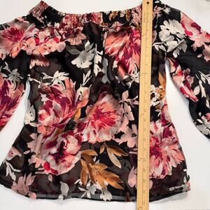 The WHITE HOUSE BLACK MARKET Floral Blouse in size small. Made from a silk blend fabric with an organza texture, this blouse features an off shoulder neckline, long sleeves, and a pullover closure. New with tags. No imperfections. Size small.