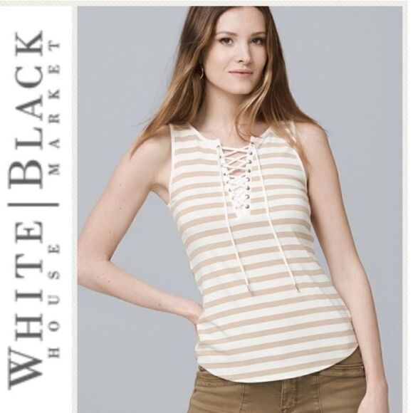 White house black market women's top. Size XS. Sleeveless. Front tie. Tan and white stripped. Cotton blend. Like new. No tears or stains.
