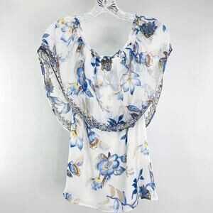 WHITE HOUSE BLACK MARKET White Blue Floral Off-Shoulder Beaded Boho Top Size XXS