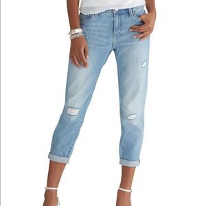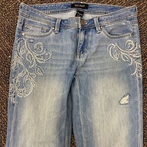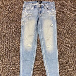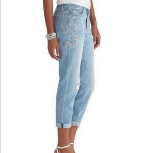 Light Wash Embroidered Girlfriend Jeans. EUC, great shape, size 0, gently distressed, can wear easy rolled cuff, scrolling embroidery and rhinestone embellishment, universal fit, Eased through the hip and thigh, sits just below the waist, Light wash, approximately 27” inseam. See pictures for details.