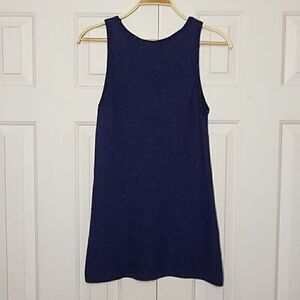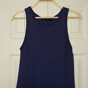 Sparkly sleeveless tunic sweater tank. Metallic purplish blue threading. Ribbed knit. Criss cross braiding on the neckline and straps. Offers plenty of stretch. Great layering piece!