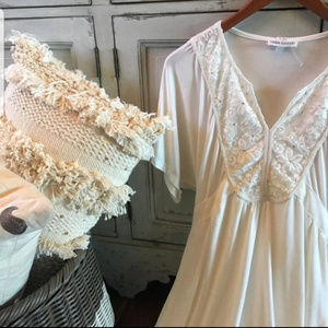 Darling boutique mini dress. Off white stretchy soft knit. Double lined bottom. Wide dolman short sleeves for that draped fit. Bohemian lace and beads at neckline. Empire cut with elastic at back & ties around an adjustable fit. Perfect beach dress! Boutique White Kimono Dolman Bohemian Crochet Lace Resort Beach