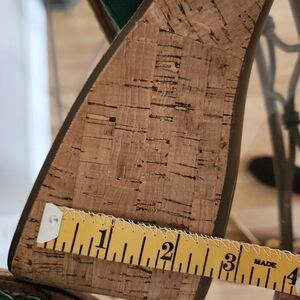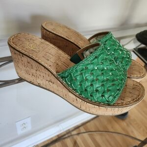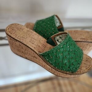 Stylish green woven platform sandals with cork soles. Perfect for casual wear. the heel height is 3 inches and the front of the sandal is 1.5 inches. refer to photos. shoes have the original sticker on the sole, and they have been worn only one time