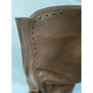 The lion riding boot from White Mountain shoes features one strap in the front and 2 straps that crisscross in the back. Large stretch gore in the back of the boot. Working buckle at the ankle. Full working zipper. Studs at the top of the boot on one side. Decorative inside lining.