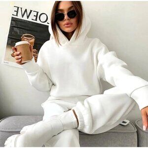 WHITE SIZE LARGE VELVETY SWEATSHIRT AND PANTS CROPPED HOODIE COORDINATED SET